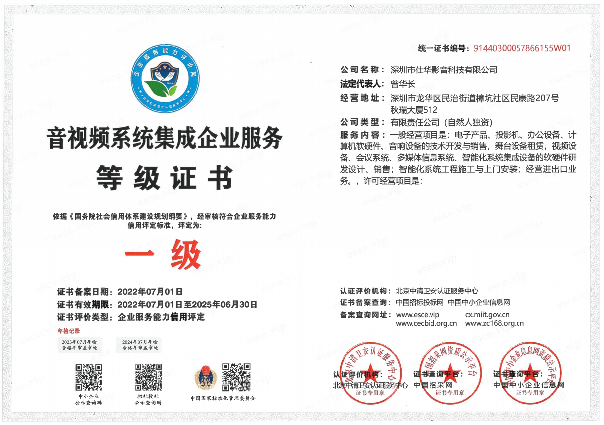 此次仕華科(kē)技(jì)獲得(de)《音(yīn)視(shì)頻(pín)系統集成企業(yè)服務等級證書(shū)一(yī)級》證書(shū)認證,再一>(yī)次肯定了(le)仕華科(kē)技(jì)在音(yīn)視(shì)頻(pín)系統集成工(g×ōng)程服務領域所具備的(de)實力及廣闊的(de)未來(lái)發展前景。