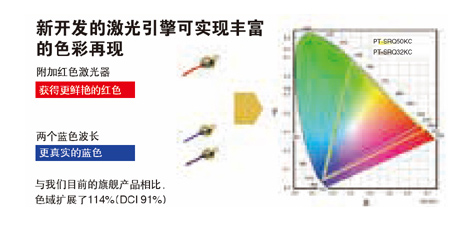 突破性的(de)PT-SRQ50KC采用(yòng)了(le)新型紅(hóng)藍(lán)雙色激光(gu≤āng)技(jì)術(shù),實現(xiàn)更鮮豔的(de)紅(hóng)色和(hé)更真實的(de)藍(lán)色。新型激光(guāng)引擎色域範圍是(shì)£松下(xià)傳統PT-SRQ32KC色域的(de)114%,實現(xiàn)逼真的(de)色彩表現(xiàn)。 |