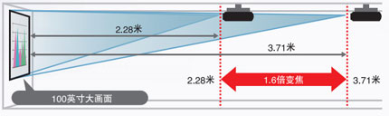靈活安裝 - 1.6倍變焦鏡頭和(hé)鏡頭位移 PT-SMX52C系列投影(yǐng)機(jī)采用(yòng)1.6倍變焦鏡頭和(hé)鏡頭位移功能(néng),實現(xiàn)了(le)在不(b>ù)同環境和(hé)不(bù)同尺寸屏幕投影(yǐng)的(de)靈活性。為(wèi)了(le)呈現(xiàn)10β0英寸大(dà)畫(huà)面圖像,投影(yǐng)距離(lí)範圍可(kě)從(cóng)約2.28米*✔3擴大(dà)至約3.7米*3。